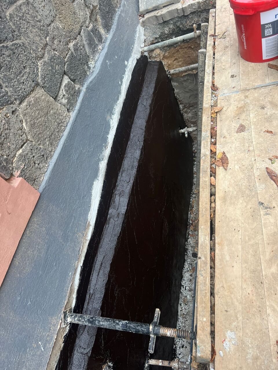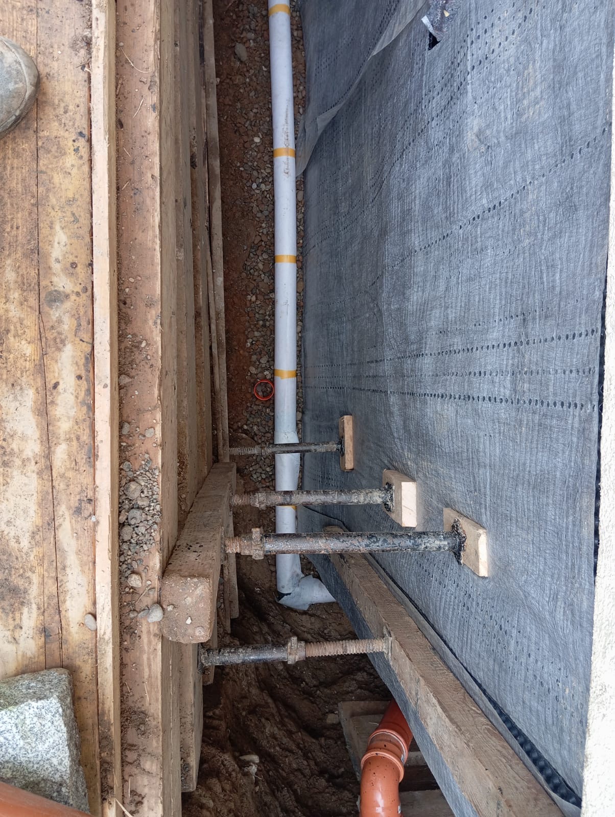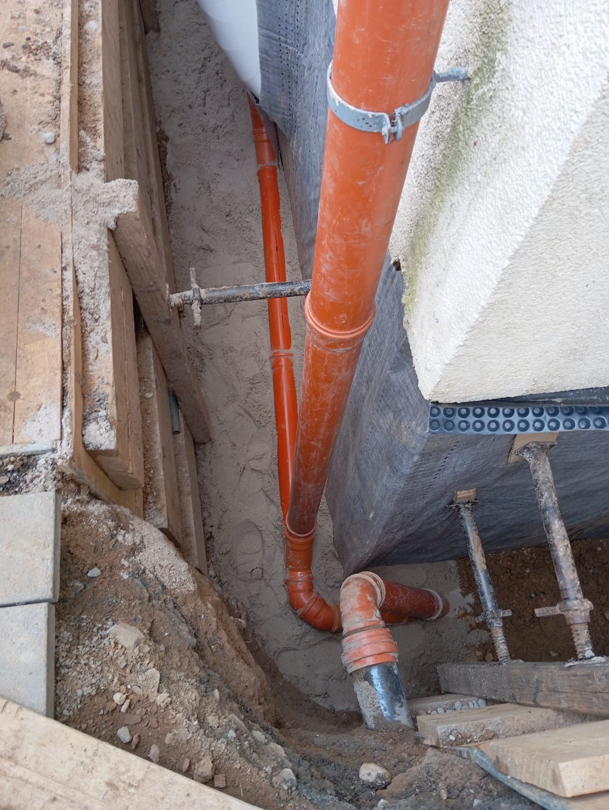Unsere Arbeiten umfassten den kompletten Aushub entlang der betroffenen Kellerwand, die Freilegung und Entfernung der alten Rohrleitungen sowie den Einbau neuer, fachgerecht verlegter Abwasserrohre. Anschließend wurde die Kelleraußenwand sorgfältig gereinigt, abgedichtet und mit einer hochwertigen Bitumenbeschichtung sowie Schutz- und Dränplatten versehen.