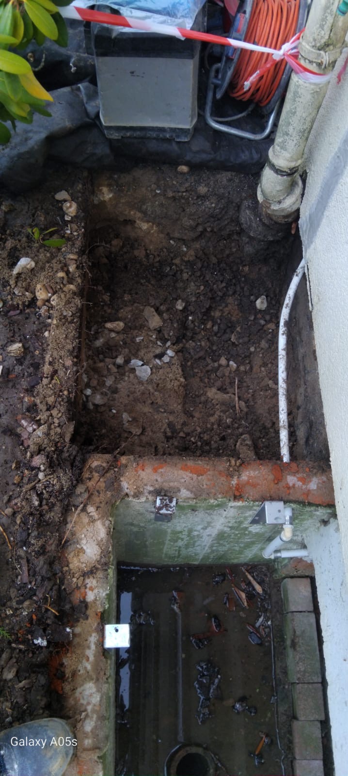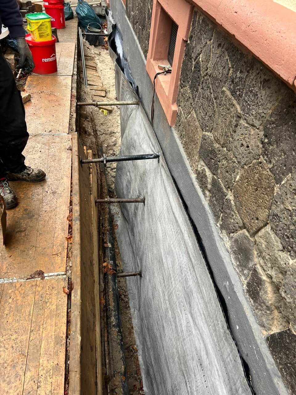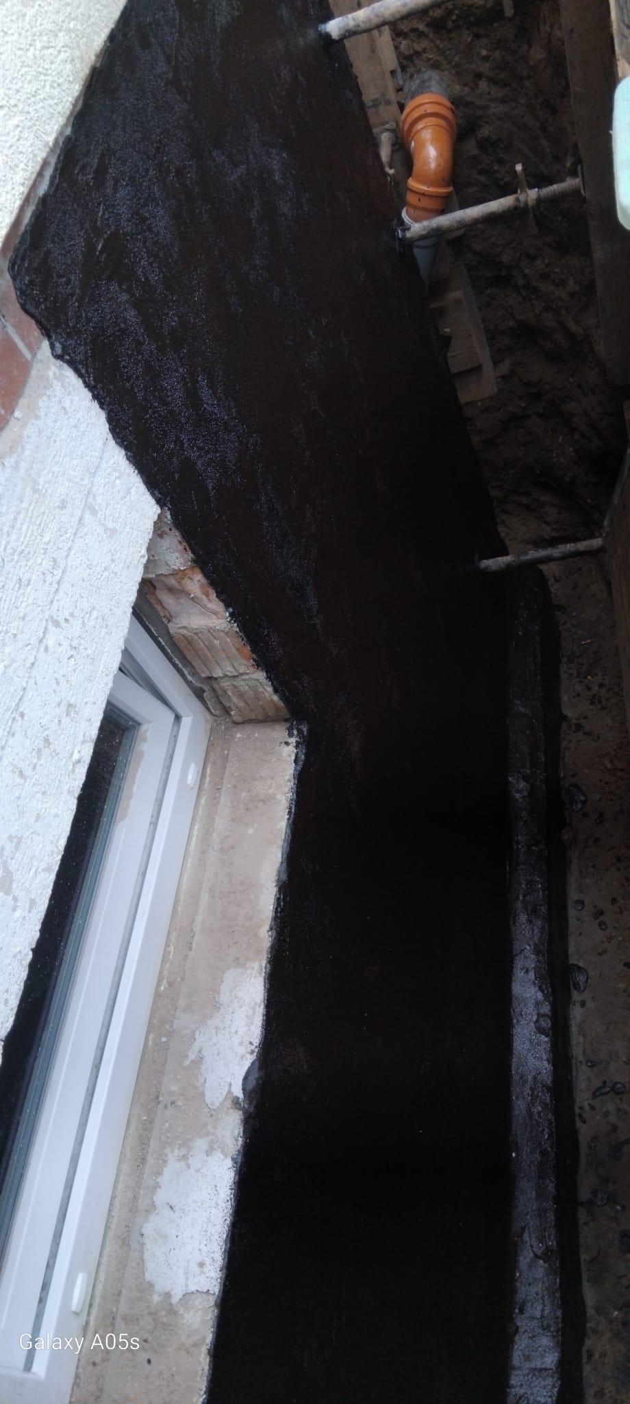 Unsere Arbeiten umfassten den kompletten Aushub entlang der betroffenen Kellerwand, die Freilegung und Entfernung der alten Rohrleitungen sowie den Einbau neuer, fachgerecht verlegter Abwasserrohre. Anschließend wurde die Kelleraußenwand sorgfältig gereinigt, abgedichtet und mit einer hochwertigen Bitumenbeschichtung sowie Schutz- und Dränplatten versehen.