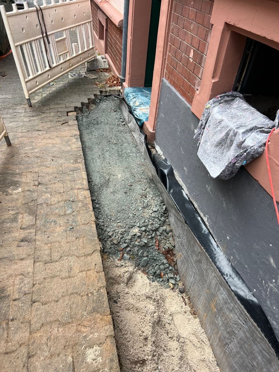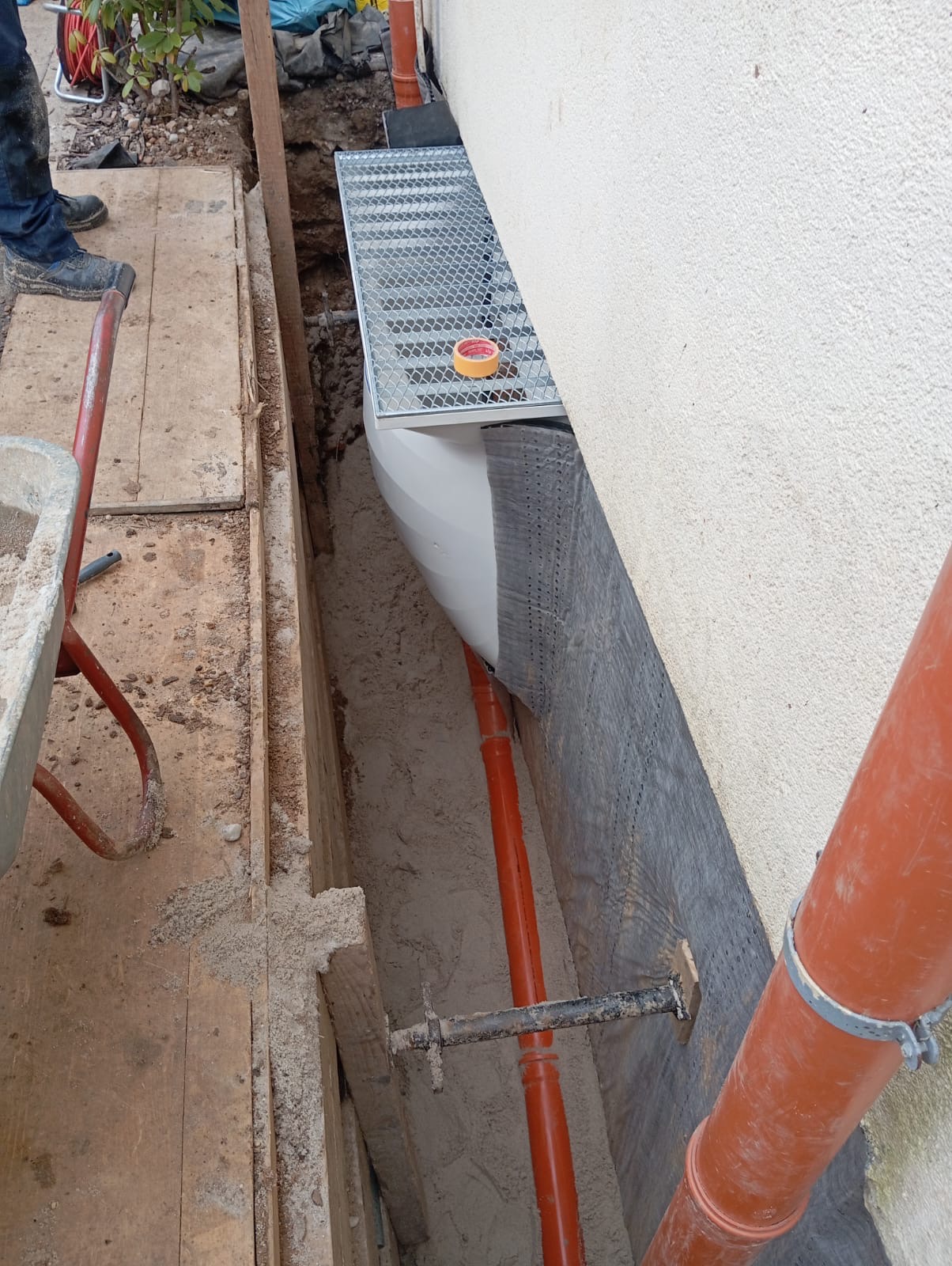 Zusätzlich installierten wir ein neues Drainagesystem mit Filtervlies, um zukünftig anfallendes Sickerwasser zuverlässig abzuleiten. Ein neuer Lichtschacht und die Wiederherstellung der Oberfläche mit frischem Pflanzbeet und sauberem Abschluss sorgen nicht nur für trockene Wände, sondern auch für eine optisch ansprechende Lösung.