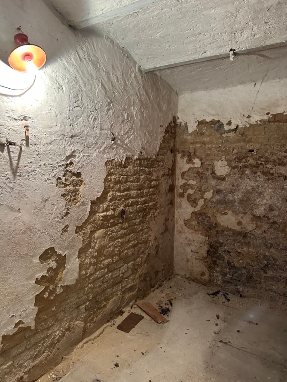 Im Innenbereich entfernten wir den alten Putz und kratzten die Fugen sorgfältig aus, damit die Wände schneller trocknen konnten. Bereits nach drei Monaten war der muffige Geruch vollständig verschwunden – ein deutlicher Beweis für den Erfolg der Sanierungsmaßnahme.